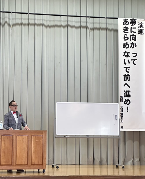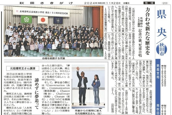 いきなり秋田市から五城目町へ転居した私は、友達が少なかったというより、私のことを誰も知らなかった、当然である。そこで、私は、1年生で生徒会長に立候補したのだった。全校生徒の前で、「自己紹介ならびに生徒会の方針」などを声高らかに演説した結果、ほとんどの生徒が私のことを周知してくれた。もちろん落選はしたものの、「1年生の分際で生徒会長に立候補した奴」と永遠に消えることはない。吹奏楽部で一緒になった親友(島崎徳之君)もできた。3年次は島崎君が会長、私が副会長になった。この島崎君が後に五城目小学校の校長になり、150周年記念講演会に呼んでくれた際にこのような話もした。(写真)実は、中学時代に今の職業のきっけになるある衝撃な出来事が起こる。それは次回号に書くので、お楽しみに。