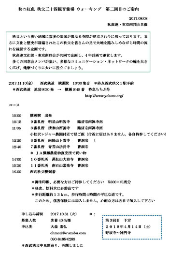 秋高連・東京南翔会共催の秩父三十四観音霊場を巡るウオーキングの第2回目が11月10日(金)に全県8校同窓会から20名が参加し、横瀬駅に集合10時に出発し、 9番札所「明星山明智寺(臨済宗南禅寺派)」、8番札所「清泰山 西善寺(臨済宗南禅寺派)」、6番札所「向陽山卜雲寺(曹洞宗)」、7番札所「青苔山法長寺(曹洞宗)」、10番札所「萬松山大慈寺(曹洞宗)」、11番札所「南石山常楽寺(曹洞宗)」の6霊場を約2万歩、13Kmの道程を予定通り4時間で全員元気に走破しました。特に8番札所・ 西善寺の樹齢700年のコミネモミジが紅葉した巨木に驚きました。巡礼・沿道の民家の生け垣にフラワーパーク看板が貼られ、それぞれの家での花が咲き巡礼者を和ませてもらい、紅葉の進んだ秩父路を楽しみ天候に恵まれ素晴らしいウオーキングでした。 予定より早く西武秩父駅に着き、都合のつく仲間で駅店舗内休み処で一杯やり交流したようです。東京秋工会のメンバーは3時25分発特急で帰宅しました。コースを下見してくれた。幹事の皆さんありがとうございます。第3回目もよろしくお願いします。