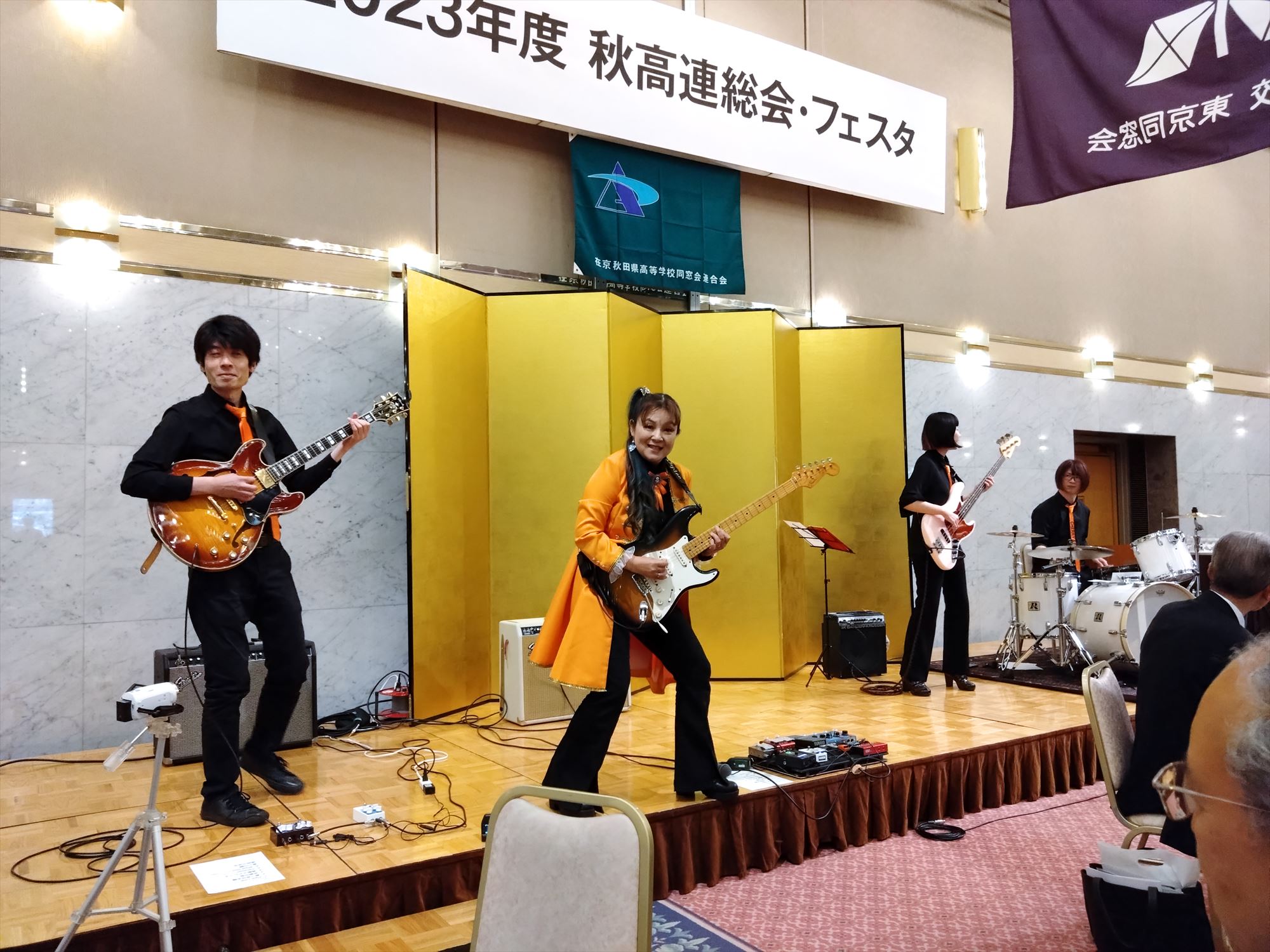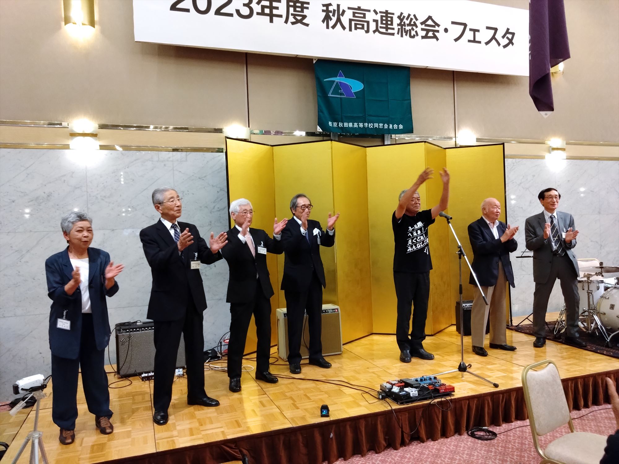 芸能公演は秋田工高の山形俊男さんと由利高の小林隆子さんの民謡でスタート。 続いて湯沢翔北高の大島孝子さん率いる「秋田の伝統と文化を学ぶ会」8名による西馬音内盆踊り。 どん尻の芸能公演はエレキバンド(Cherry Spice)による大音響のサウンド(歌はなし。楽器のみ。)です。 演奏曲はなんと、演歌メドレー。皆が知っている楽曲に会場のあちこちで口ずさむ人がいました。 バンド演奏の最後は「高校3年生}と「青い山脈」。舞台の上や会場のテーブル脇で全員で合唱しました。