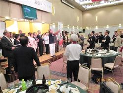 続いて、秋田魁新報社東京支社長の鹿川公利氏が乾杯指名を受けて登壇したその時、司会者の武藤三郎さん(大曲工高、新役員/副幹事長に就任)が、「今、県議会において、慶事の際の乾杯は秋田銘酒をもってすべし」との条例が可決したとアナウンス、一瞬会場にどよめきが走りましたが、無事、声高らかに乾杯し歓談タイムとなりました(このジョーク、座布団何枚?)。恒例の芸能公演を楽しみながら各テーブルを回り旧交を温める光景が見られました。