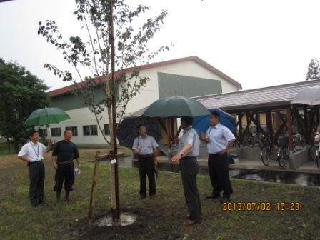 学校案内をする佐藤秋田高副校長 秋田北鷹高の記念植樹 | |