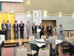 好天に恵まれた5月27日(日)、アルカディア市ヶ谷(私学会館)富士の間において、平成30年度秋高連総会・フェスタが初めて同時開催され、来賓及び秋高連会員延べ210名余の皆さんに出席して戴きました。 総会は午前10時に開会し、議長に石谷洋子さん(横手城南高)を選出し、上程した5つの議案について審議した結果、全ての議案が原案どおり異議なく全会一致で承認されました。このうち、第5号議案の役員改選については、改選17役員について、27名の候補者から協力が得られ、役員選考委員会において17名を選考、役員会、運営委員会の議を経て総会に諮るに至った旨、経過報告がありました。新会長に望月久さん(大館鳳鳴高)が選任され、役員相互の連携と加盟各同窓会の協力を得て会務執行に当たって参りたい旨、就任挨拶されました。望月新体制に大いに期待したいと思いますし、加盟各同窓会にはなお一層のご支援ご協力をお願いしたいと思います。 今年初めてとなった総会・フェスタの同時開催(全て富士の間にて開催)につき、10時開始、11時に終了した総会後、フェスタ準備のため1時間休憩を取り、予定より5分遅れて12時05分から第1部講演会、第2部交歓会とプログラムを進行。講演会は、ジャーナリストの藤井茂氏(大館鳳鳴高20期生、一般社団法人新渡戸稲造基金理事長)が、「新渡戸稲造−その慈悲深き生涯−」を演題に、自身の長年にわたる新渡戸稲造の研究結果に基づき、大変穏やかな語り口で分り易く丁寧にプレゼンテーションしてくれましたので、聴講の全員が大満足したことに間違いないと思います。今、日本では「ふるさと納税」について、光と影に直面している中、新渡戸稲造の慈悲深き生涯を聴き、寄附の本質を改めて考えさせられる一日となりました。講師を快諾して戴いた藤井茂氏に秋高連挙げて感謝申し上げます。 第2部の交歓会では、秋田県教育庁教育次長の眞壁聡子氏が来賓挨拶の中で、高校スポーツ、文化部の全国レベルの活躍ぶりの紹介に続いて、高体連秋田県大会真っただ中のところ、硬式野球決勝(金農対由利工)の途中速報が報告されると、該当同窓会席から歓喜の叫びと拍手が会場に響きました。やはり母校生徒の活躍は同窓生として誇らしいものです。 続いて、秋田魁新報社東京支社長の鹿川公利氏が乾杯指名を受けて登壇したその時、司会者の武藤三郎さん(大曲工高、新役員/副幹事長に就任)が、「今、県議会において、慶事の際の乾杯は秋田銘酒をもってすべし」との条例が可決したとアナウンス、一瞬会場にどよめきが走りましたが、無事、声高らかに乾杯し歓談タイムとなりました(このジョーク、座布団何枚?)。恒例の芸能公演を楽しみながら各テーブルを回り旧交を温める光景が見られました。 芸能公演に快く出演して下さった皆様には秋高連として心から御礼申し上げます。 秋高連の決まりごとの一つは、秋田ふるさと応援団が秋田県、秋高連にエールを送ること(今回は、能代工高の大渕清一さんが務めました)と、参加者全員で「ふるさと」を合唱することです。添付写真のとおりステージ一杯賑やかに合唱した後、手塚慶一さん(横手高、副会長再任)の閉会挨拶をもって、初の総会・フェスタ同時開催を終了しました。 ご来賓各位及び参加同窓会の皆様には本当に有難うございました。そして大変お疲れ様でした。 (2018.6.4 秋田中央高 水沢誠一 記)