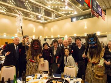 第2部は、主催者及び来賓代表の挨拶などのセレモニーに続き、地元秋田から取り寄せた銘酒で乾杯し、各校同窓会の垣根を越えた交流をはじめ、各界代表の皆さんと和やかに懇談しました。また、秋高連メンバーによる民謡披露のほか、プロの出演者による熱唱で会場が大いに盛り上がりました。
